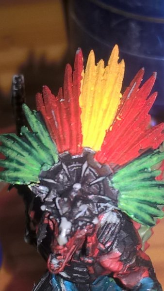 Also good paint scheme. Just watch out and remember that if you add too many different colours there should be something about them that brings them together (like the final highlight or washing or a colour mixed onto every basecoat). If not the model will look fractured and it´ll be hard to look at.