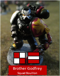 As per the fluff, each of my Templar squads/squad leaders is named for an ancient Terran crusader. Squad Bouillon takes its name from Godfrey of Bouillon, first king of Jerusalem (who actually refused to use the title "king" during his lifetime, because there is no greater king than THE EMPRAH!). As you can see I also made up some squad banners that have been yet to be created, displaying heraldry that has yet to be repainted on most of the minis. Its a work in progress, I promise!