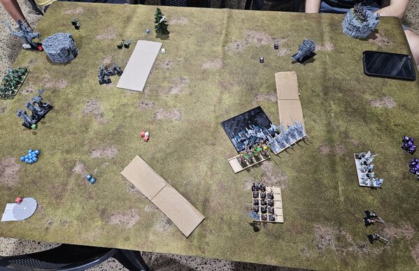 The Lizardmen have been surrounded! They need to hold for 6 turns to win (skinks not included). This was a custom scenario we made up, as I'm running a degenerate 1500 list and my opponents were not. Spoiler: My list === Aeontezin's Guard [1499 pts] Warhammer: The Old World, Lizardmen === ++ Characters [697 pts] ++ Aeontezin [379 pts] - Great weapon - Heavy armour (Scaly skin) - General - Carnosaur - Armour of Meteoric Iron - Glyph Necklace Skink Chief [318 pts] - Additional hand weapon - Light armour (Calloused hide) - Battle Standard Bearer - Stegadon [Giant bow] - Talisman of Protection ++ Core Units [406 pts] ++ 19 Saurus Warriors [306 pts] - Thrusting spears - Shields - Heavy armour (Scaly skin) - Spawn Leader (champion) - Standard bearer - Musician 10 Skink Skirmishers [50 pts] - Hand weapons - Javelins - Shields - Light armour (Calloused hides) 10 Skink Skirmishers [50 pts] - Hand weapons - Javelins - Shields - Light armour (Calloused hides) ++ Special Units [196 pts] ++ 4 Kroxigors [196 pts] - Great weapons - Heavy armour (Scaly skin) ++ Rare Units [200 pts] ++ Troglodon [200 pts] - Venomous talons - Venom spray - Heavy armour (Scaly skin) - Skink Oracle with hand weapon (required) --- Created with "Old World Builder" [https://old-world-builder.com] Turn 1 - me With 18 inches between us this was going to get hairy! We took the eagle down and slowly moved forward. Their turn 1 The wild riders hit the skinks who stand and shoot one, but the skinks lose and somehow FBIGO. I think I'd preferred to have fled so I could shoot the wild riders with my other unit. Their cold ones decide to run to the other side of the table. How crossbowmen do a wound or two to the stegadon. My turn 2 The carnosaur charges the treeman and wins combat and leave him on a couple of wounds. The carnosaur takes a wound. Their turn 2 Carnosaur kills the treeman and runs off the table Kroxigor make the archers flee the table. Wild riders and cold ones charge the Saurus and best them badly and they FBIGO. My turn 3 The heavy cav kill the Saurus unit. The cold ones turn around ready to get the stegadon. The stegadon charge and connect with the crossbowman. It has 2 wounds left from being shot at, but it wins combat and takes them out. Their turn 3 My turn 4 - then as below For the rest of the game - the cold ones eventually charge the stegadon, shooting does nothing and they just manage the 2 wounds they need The carnosaur gets combat with the halberdiers and wins. The spearman get to the Kroxigor and wipe Kroxigor out. At the end of the last turn the carnosaur is on 6 wounds. The dark elf got his hero with a monster slayer into combat but missed all 3 4+ to hits. All woodies are gone. The cold.ones are there, as are the spearman unit. But this means the Lizardmen are the winners! What did I learn? Such a degenerate list.... I think if we had of kept playing the carnosaur would have wiped out both armies. Wow.
