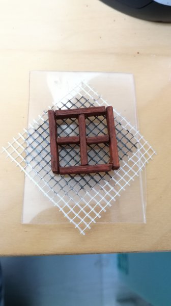For the front façade I wanted a window. I made it out of square cocktail sticks. This will be backed by a fiberglass tape on clear plastic to represent stained glass.