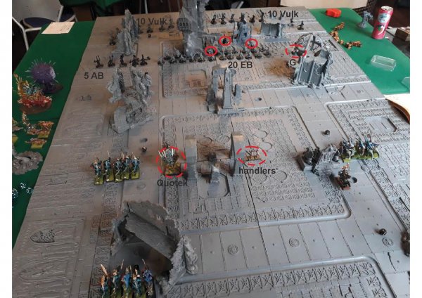 my opponent places the heartguards on my left (supported by the general and a battlesmith), then 20 vulkite in almost central position with a runesmiter and the magmadroth) and 20 vulkite on my right, with the last battlesmith.