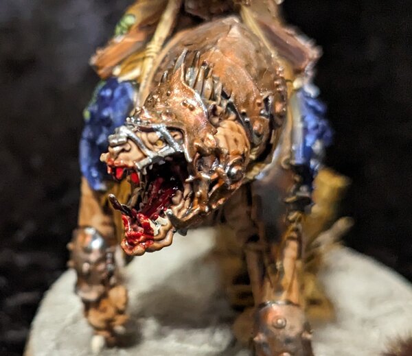 I rarely post actual work in progress shots, but I'm having quite a bit of fun with the first orcs for my personal collection. First step has been the Killaboss on Great Gnashtoof, also known as a naked mole rat. I painted plenty of kruelboys models before, but they have always been heavily converted for my warriors of Nurgle army. As such this has been a refreshing change of pace. Next is going to be metallics, then touch ups, then details, then final touch ups and basing. Because there is so little skin in relation to all the other parts, particular green skin of my orcs is going to be part of final details and second to last. I'm going to go with a very subdued camo color for the green skin.