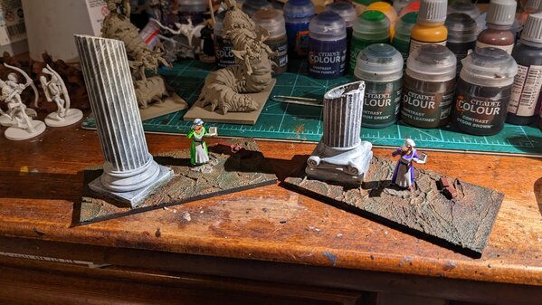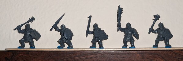 Today's #conversioncorner for my Guild Myrmidian project is a way to make use of leftover arms from the halfling monk project from yesterday. The dwarves who trade in Talabhiem and Talabecland as a whole do not shy from trade with the cult of Myrmidia. Indeed the guild myrmidian purchases much of its armor from dwarven smiths. In their downtime many of these dwarven tradesmen fight in the hall of fists, sacred training grounds for Myrmidia's followers attached to every temple. From simple training posts outside a community shrine to a full training complex in Magritta (Estalia) across from the Archecclesiatium (main temple) of Myrmidia, all adherents are expected to keep themselves ready to fight. Regardless of the size of the venue, all are welcome to hone their skills under the auspice of the Goddess of War's holy ground, with any weapon imaginable (though Spears are of course favored.) Betting is natural, but is limited to fistfights by custom. In this, dwarves excel, often leveraging their considerable dwarven toughness to withstand their opponent like a granite cliff face. In the event of a raid or hasty defense, those fighting in the hall of fists will take up makeshift armament and defend themselves. - - - - - Einherjar from Wargames Atlantic and mantic goblin arms.