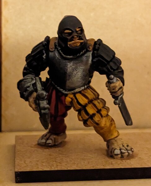 5 historicals for the guild myrmidian. 1 test paint job of a shield-swapped man-at-arms from mantic. 2 black orcs for Kevin