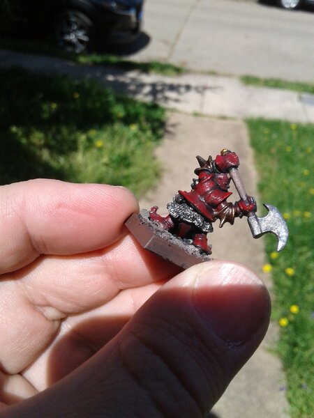 Nice work on the corroded metal effect on his shoulder. Nice looking chaos dwarf! I like the red too.