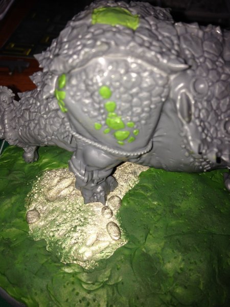 Part 2....or part 1 continued or The Making Of.... More painstaking propping to come.... Here we see the beautiful nature of balance and how using what you have to hand can help you glue something in place while you go do something more important like pretend to have a life Here is my Stegadon on his base I incorporated a base I had that had some raptor prints in it - I wanted to have the dead raptor under him seen here (kinda) but It didn't have a whole lot of body left so I abandoned the idea. Here we see a puddle of glue.... these can dry beautifully into all sorts of little patterns but I kept filling it with more - the idea was to make the cage a flat base and hide the lines the material had - in future I will use better equipment other than a elongated base. (My bad). here we can see I used a ton of green stuff to make a muddy battlefield effect for the base it was due to the angel the velociraptor base glued on that I needed to make a raised base. I also did dots in it with a toothbrush to emulate the dotted effect already on the velociraptor base - although then I used a pokey tool to do it as the toothbrush didn't seem to work in the light I was making it in. Then in the morning the toothbrush dots were perfect and I was gutted. Here are the rocks I made out of green stuff to again emulate the rocks on the velociraptor base and make it into one coherent piece. here is the un-recommended way to unpaint a model ^.^ - you can scratch chip paint of a metal model it takes a long time and is annoying and not 100% effective. The competition was for unpainted so I yeah fucked this guys paint job up...not proud....or am I.....Mwhaha... (This is the victim skink grabbed in by the gorilla - the under tone of this was after the aftermath of harambe so I thought it was an interesting thing to do to evoke whether the gorilla was grabbing it to play with or to harm etc) here are the bones of some snakes fed to the beast they are some long spines indeed. I did dem horn tings and dem scale tings to quote batman (lego) "First try..." 10 again? Okay so we continue soon...