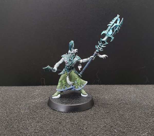 Hey everyone! Hope you're doing well this morning! I am almost done with my Soulrender/ Elathain, I have been focusing on the Eel, Weapon and a real first attempt at a glow from the Latern. The Eel I wanted to be colorful and a warm focal point. Inspiration came from when I was playing Path of Titans when I was playing my Megalania (very large Komodo Dragon species) and one of the skin options is similar to this. I very much enjoy the sudden color change from body to head. For the weapon I was inspired by those tribes who use whale bone to carve weapons and tools. On the blade of bone I also painted a simple serpent sea monster by highlight the back scales, eyes and belly scales in black. The latern and glow is a first for me, and still unsure if I'll keep it. I think for a first attempt it is ok, though I may add a bit more "glow" onto the helmet if I decide to keep it. I'm not 100% how I feel about it. Need to do basecoat to the ruins on the base, but my next focus will be the cloak & cloth areas. I have also been working to improve my pictures a bit and fiddling with a better white background, though I still ideally want a better black background. Let me know what you think!