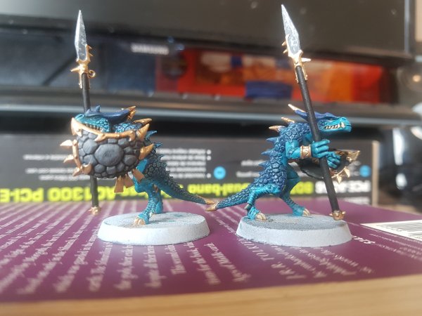 12 down, many to go! Here are two that turned out cleanest I think. For the next batch i'd like to do more of a gradiant effect on the shields rather than just layers. I think ill do batches of 10, 12 was just a bit too many. And then maybe like a kroxigor or sunblood in between each batch as a treat!