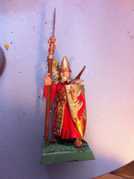 Aside from some bits and pieces my lizard man are pretty close to done so I wanted to try painting some of my island of blood minis. Done a test figure for both, heres my High Elf theme. Is the gold to intense? any suggestions? should there be white somewhere. Lastly what colour should the arrow feathers be? Colours used, gold, brown, bronze, red, flesh. Mainly p3 paints.