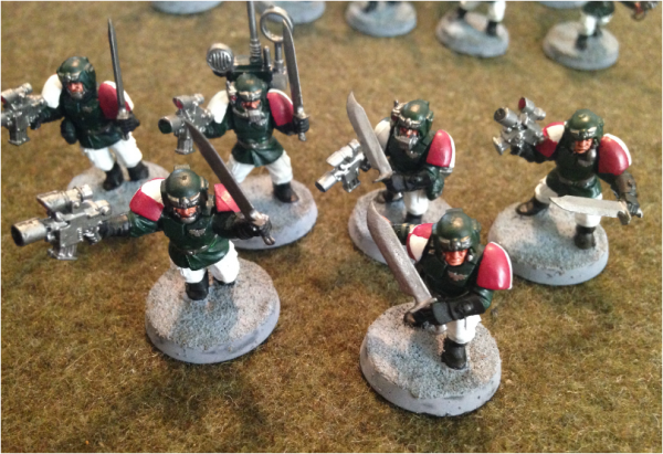 Neophytes! The stand-ins for Neophytes in my Black Templars crusade are a bunch of cadian-shock-troop-armor-wearing trainees equipped with an assortment of knives, chainswords, and pistols. I have a total of 20 of these Templars-in-training for use in the marine combat squads. Some unfortunately have been modelled with las-pistols due to budget constraints (although if its dark outside they double as squad flashlights). Modelling wise they were fun for me to make and put together, and way cheaper than buying standard space marine scouts at the time! Spoiler: Neophytes