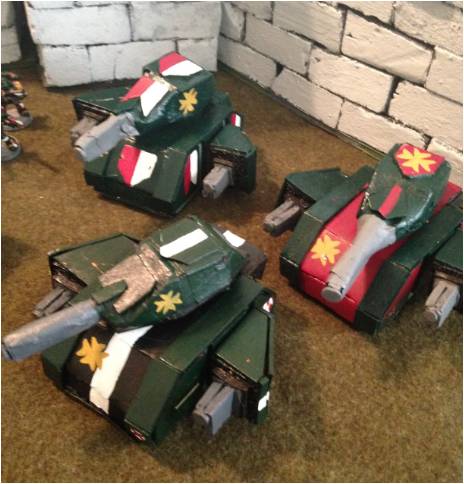 Scratch-Built Tanks! (please excuse the crudity of these models, they were made a long time ago...) So this experiment was originally undertaken to create some stand-in/proxy Rhino Transports back when I couldn't afford the actual models. Taking the experiment a step further, I wound up making some "modular" Rhino chassis's (chases? chassisses? chassis''????) with plenty of extra pieces for turrets, side guns, and even some forward-facing vindicator guns! All the tanks are made from foam board, with extra foam for the "details" on the sides. The extra turret and gun attachments are just held on with tooth-picks, so the turrets on the top can rotate for maximum pose-ability. Rhinos Here are the Rhinos themselves. Many different color schemes were tested because I couldn't decide on just one; if I were ever to go back and repaint them they would probably be matching, just with subtle variations, and maybe mimicking the heraldry of the squads I have already mentioned. Annihilators/Destructors I made enough extra pieces for three of each. VINDICATORS Also made pieces for three of these beasties. Razorback Transports Also made some razorbacks, with some fake "lascannon" and "autocannon" attachments. Razorback with "lascannon" attachment, with squad out front. I learned a lot making these stand-in models. They are smaller than normal space-marine tanks, also fairly crude. But they worked well for the budget I had! Total cost me almost nothing to make, because I already had the foam bits and paints on hand for other projects. Also learned a lot about making future scenery with this project. If I were ever to start this project over again I would use the lessons I have learned to resin-cast my Bretonnians to churn out some modular space-marine tanks. Hope you liked the picks!
